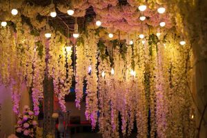Una idea para bodas de noche es la de colocar diferentes focos de luz, ya sea en bombillas o con tipo farolillos en tonos nude o con flores e ir jugando con las luces durante toda la celebración.
